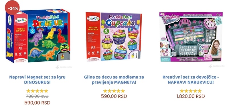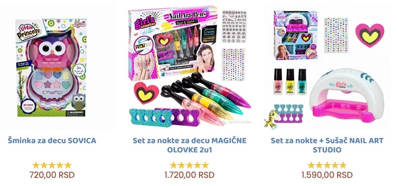 Skoro svaka devojčica voli da se "kindjuri", pa su svi kompleti koji imaju šminku i nakti odličan izbor. Što ima više delova u setu, to je on zanimljiviji. Kompleti gde one prave narukvice ili ukrašavaju nokte će Vam sigurno doneti jedan veliki zagrljaj. Takođe, dečija šminka je jako popularna, ali budite sigurni da je namenjena za decu. Šminka za odrasle nije predviđena za igru i može izazvati zavisnost.