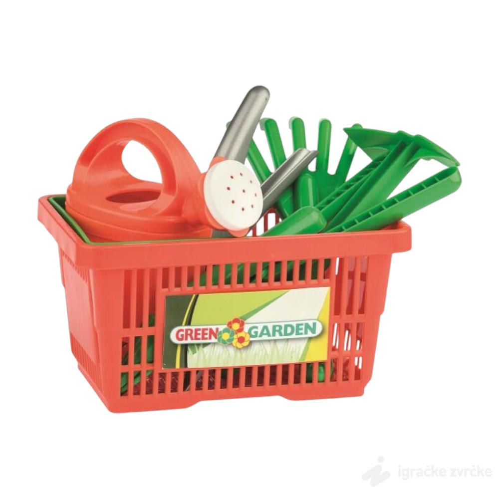 • Set se sastoji od korpe sa koficom za vodu i raznih alata za održavanje bašte