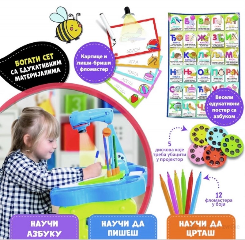 Diskovi koji idu u projektor sadrže slike i reči na ćirilici. Dete svojom rukom preslikava sliku i reč, prateći linije slova i na taj način vežba pisanje i upoznaje se sa Azbukom.