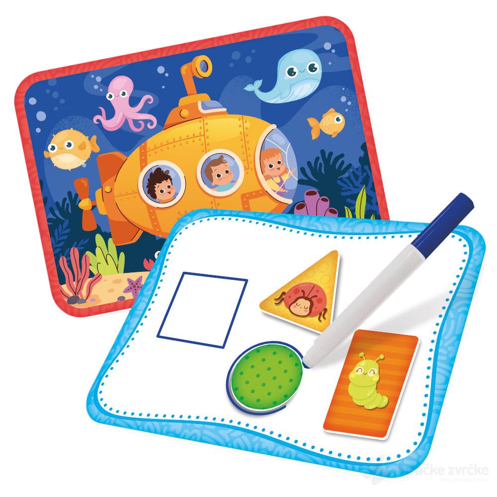 Sadržaj: tabla za pisanje i brisanje, sveska, slagalica, kombinacije brojeva, samoglasnika, siluete, boje, oblici, olovka za bebe i i vodič za aktivnosti.