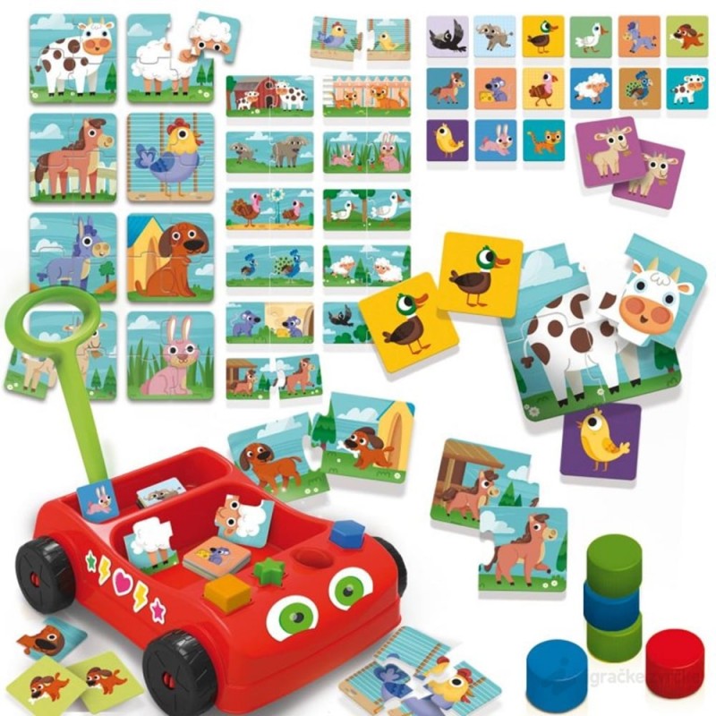 Edukativne igre i slagalice će doprineti razvoju mnogih veština i zabaviće Vašeg mališana. Sorter oblika - Vozilo ima otvore za uklapanje i učenje oblika. Mini slagalice sa životinjama od 4 dela su deci jako primamljive jer nisu teške. Igra memorije od 32 dela vežba pamćenje i uči decu koje sve životinje postoje. Slagalice Mama i Beba su logičke slagalice gde dete treba da spoji mamu i mladunče.