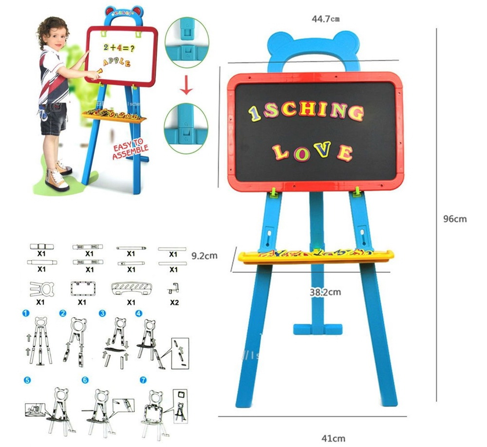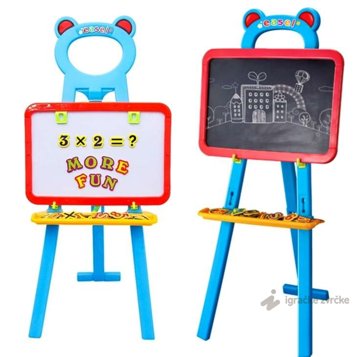 2u1 Dečija Tabla za crtanje po kojoj možete pisati kredom, kačiti magnetna slova i brojeve ili zakačiti papir i crtati po njemu! Ovo je fantastična tabla za decu koja će im biti omiljena igračka za sobu. Tabla dve strane od kojih je jedna školska tabla dok je druga magnetna. Nogari su stabilni, a visina table se može podešavati.
