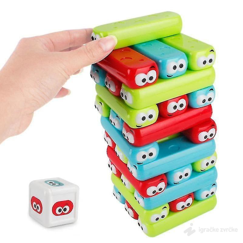ŠTA JE U KUTIJI? Kutija sadrži blokove za pravljenje kule u 3 boje i kockicu. Broj igrača: 4. Preporučen uzrast 3+.