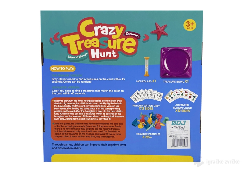 - Sadržaj uključuje: posudu za blago, peščani sat, 12 kartica u boji, 12 crno-belih kartica i 125 delova za traženje
