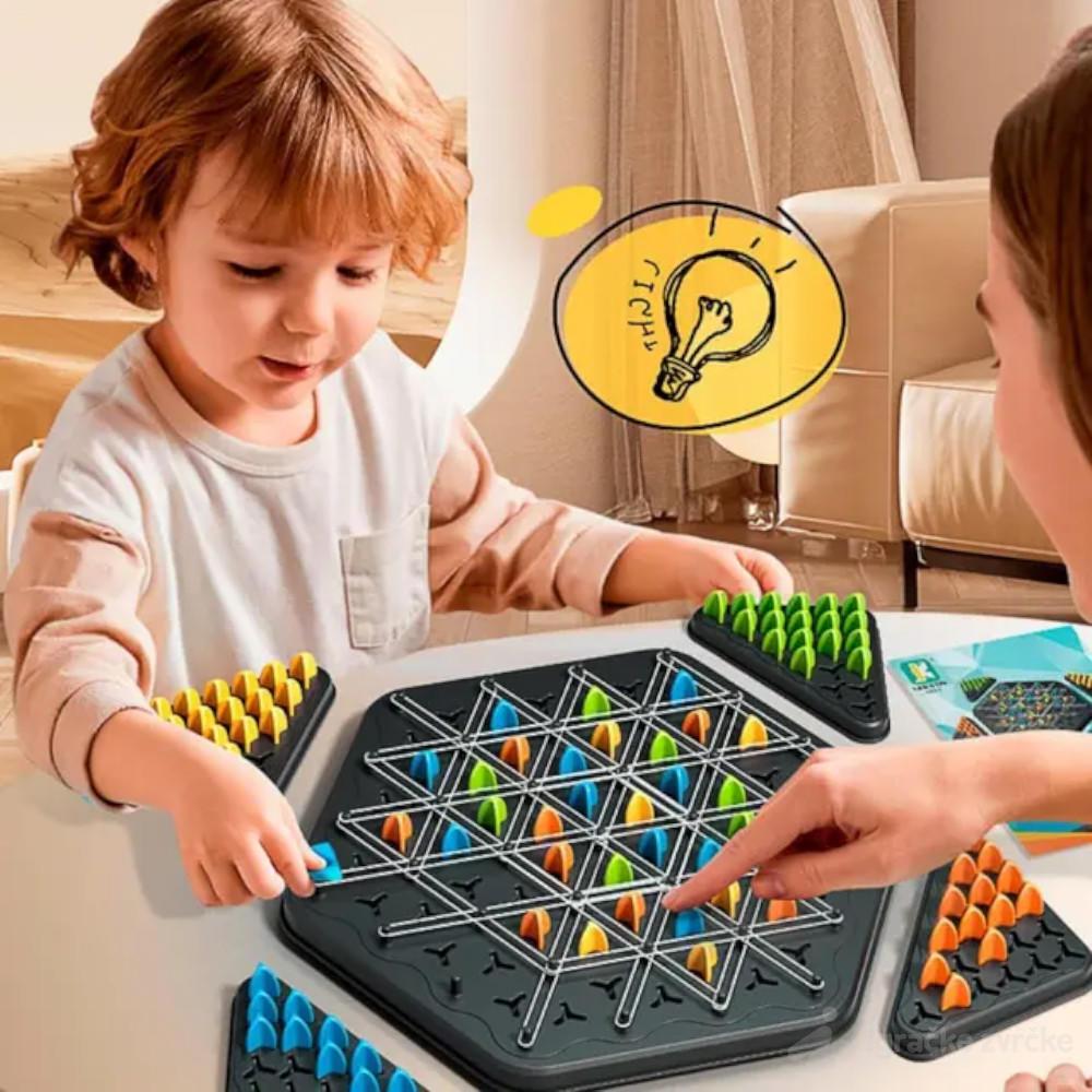 Logička igra sa elastičnim trakama osmišljena je da kroz igru razvija razmišljanje i strpljenje kod dece. Dete postavlja i pomera gumice kako bi povezalo polja i uklonilo figure prema zadatom cilju.