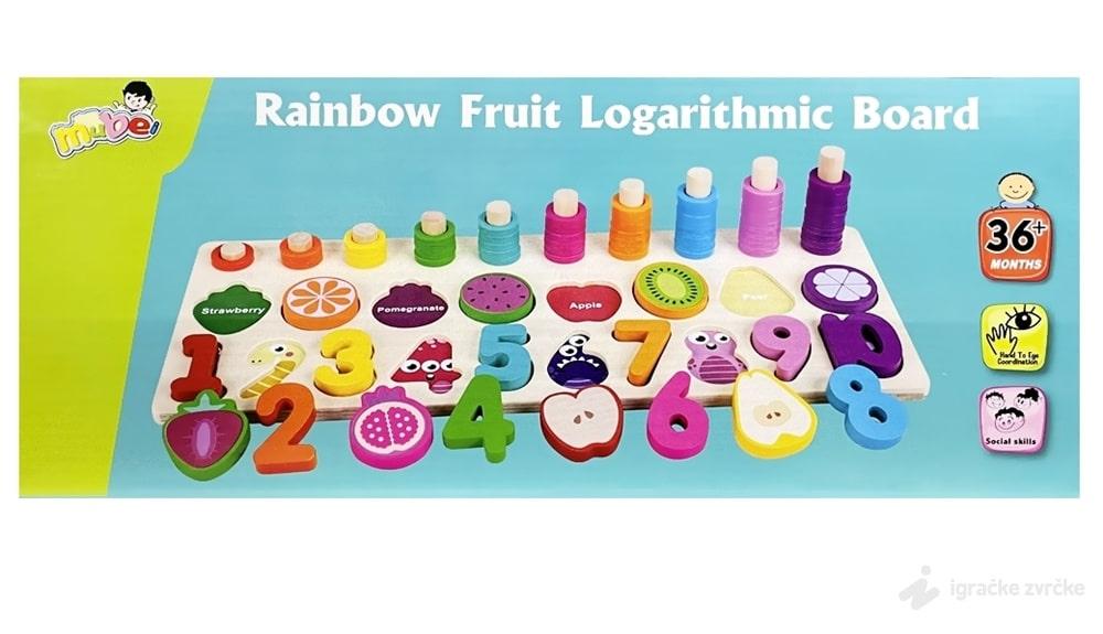 U setu dobijate drvenu tablu, drvene brojeve i voćkice, drvene štapiće i plastične krugove. Dete treba da uklopi broj i voćkicu u odgovarajuće udubljenje, a da na štapiće naređa onoliko krugova koliki je broj ispod njega. Zabavno i poučno!