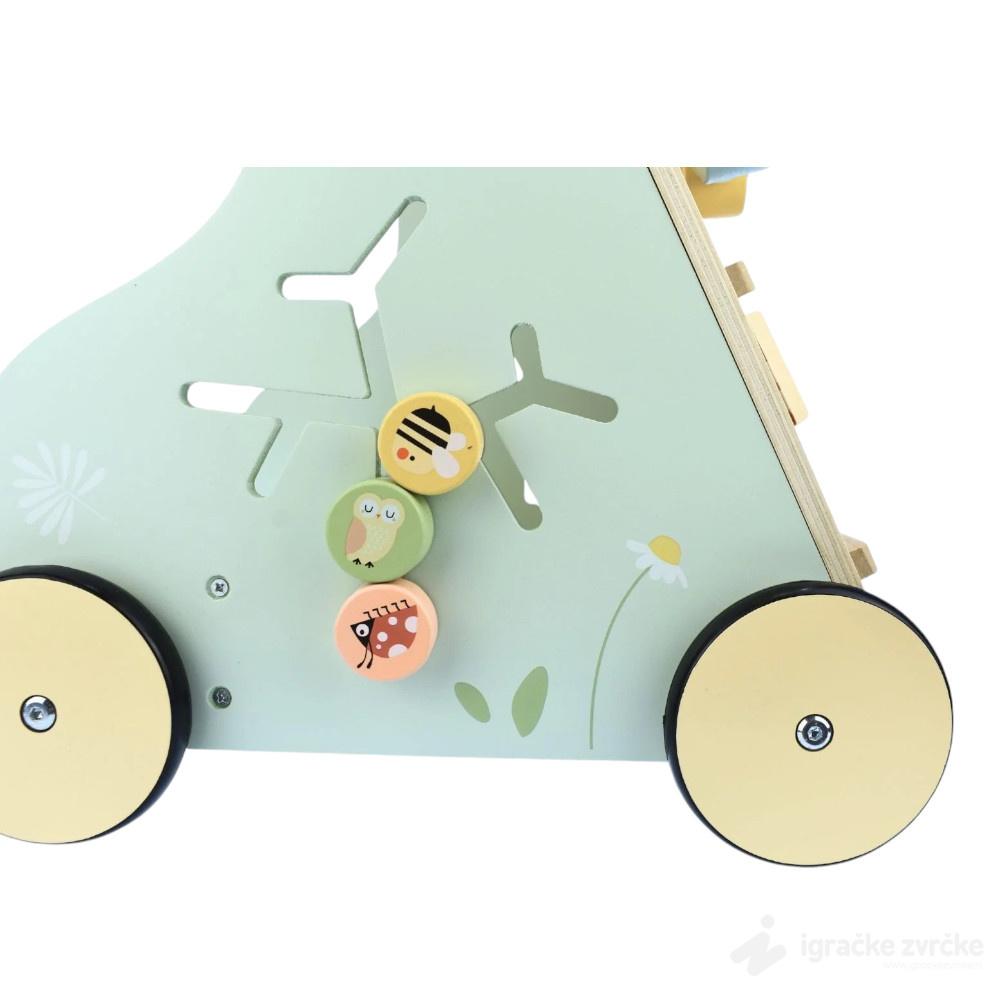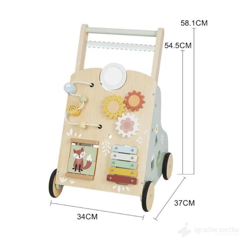 PUNO MOTORIČKIH I KOGNITIVNIH AKTIVNOSTI Ova drvena hodalica za decu uključuje metalofon, zupčanike, rolerkoster, računaljku, ogledalo, kocke, umetaljku, a sa strane ima igračke na povlačenje. Dete će biti oduševljeno i igraće se satima.