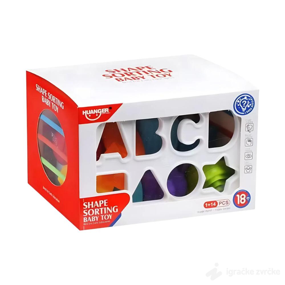 • Set sadrži edukativnu kocku i 14 oblika i slova za uklapanje