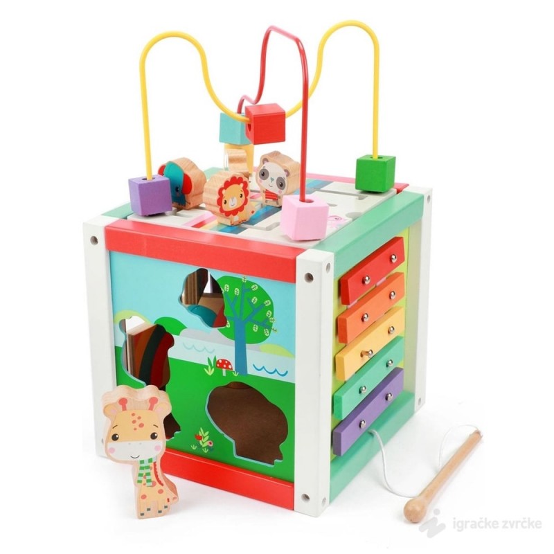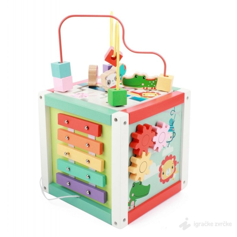 Kocka ima 5 različitih strana sa aktivnostima i bazu. Svaka strana je pažljivo i kreativno dizajnirana i traži od deteta nov način igre. Gornji deo, koji se može ukloniti, dolazi sa rolerkosterom sa velikim perlama i slagalicom.