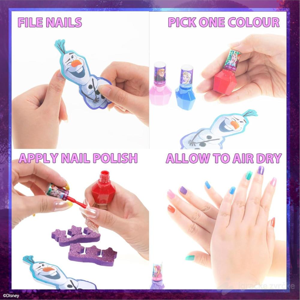 Ovaj Frozen set je odličan izbor za bezbrižnu dečju zabavu. Lakovi su prilagođeni deci i jednostavni za korišćenje, bez komplikovanih koraka.