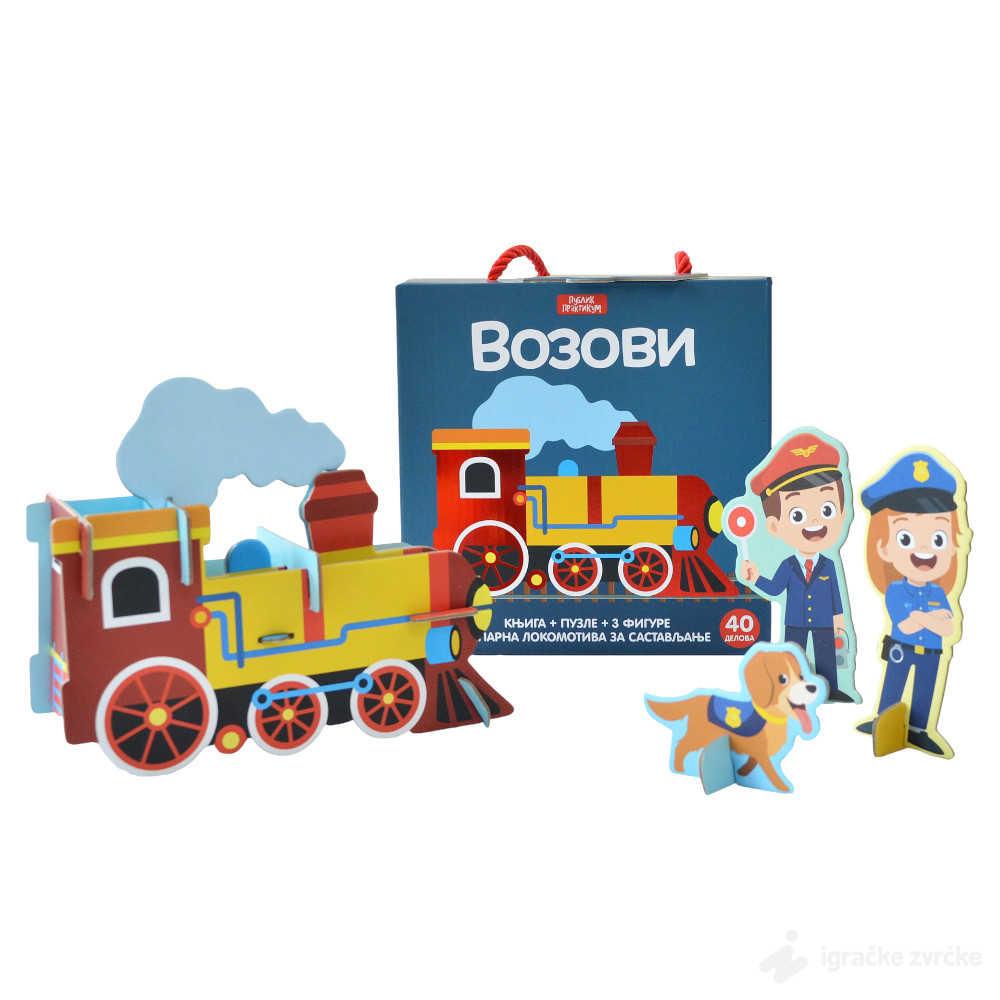 Kutija puna zabave i učenja, sadrži knjižicu od 10 strana, slagalicu od 40 delova, 3 figure i parnu lokomotivu za sklapanje.