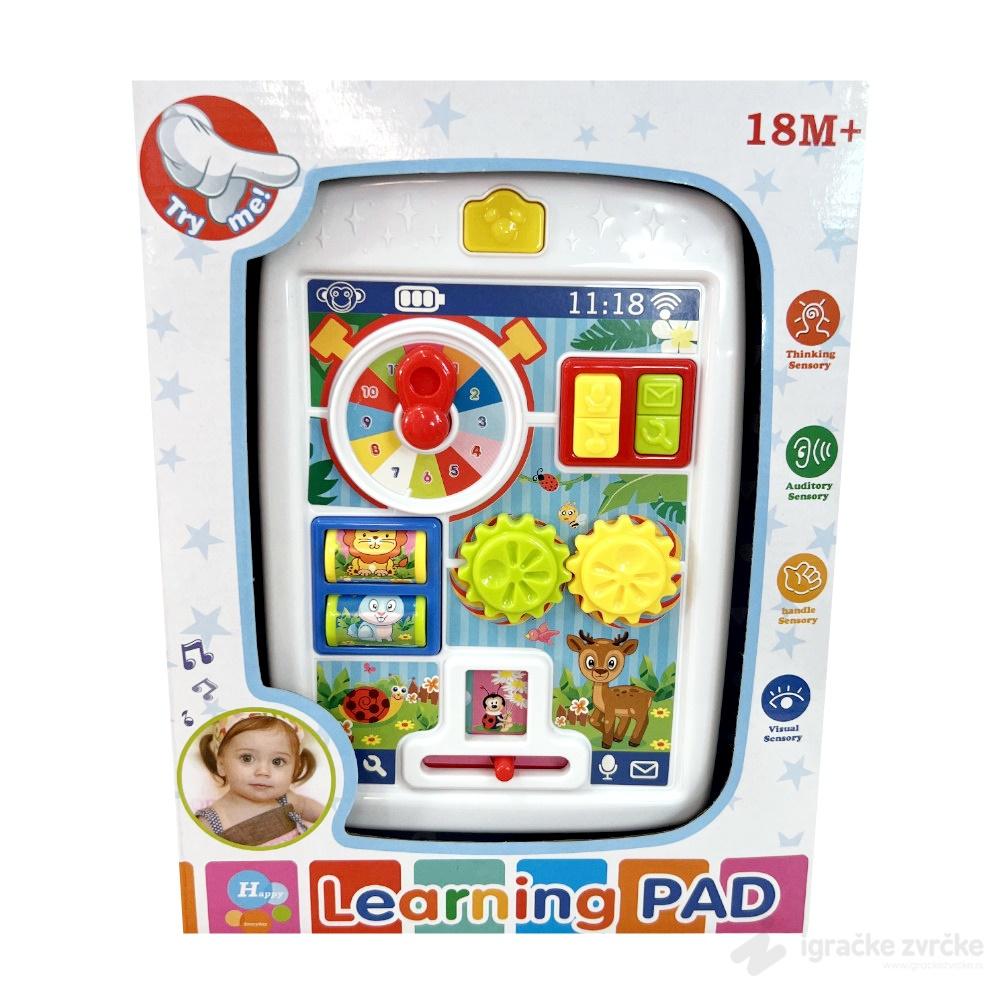 Interaktivna igračka za bebe TABLET je igračka u obliku tableta, na čijem ekranu se nalaze razni pokretni elementi. Beba će moći da pritiska dugmad u boji, okreće zupčanike, okreće kazaljke na satu, pomera zavesu sa slikom životinja udesno i ulevo.