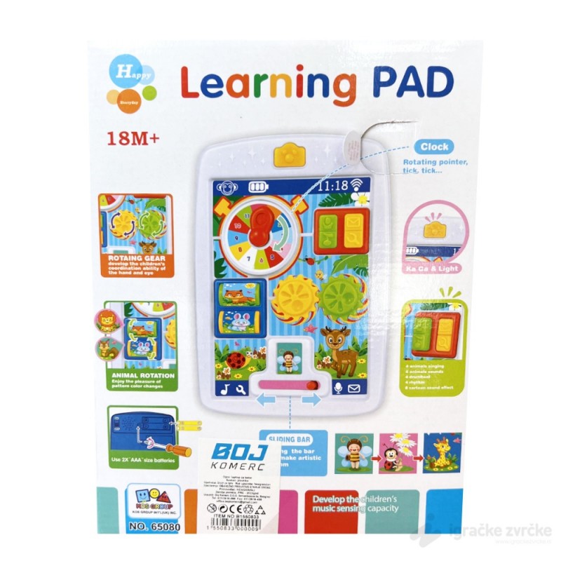 Kada je dete u interakciji sa bilo kojim elementom tablet reprodukuje različite zvukove. Igračka će razviti fine motoričke sposobnosti, koncentraciju i koordinaciju pokreta.