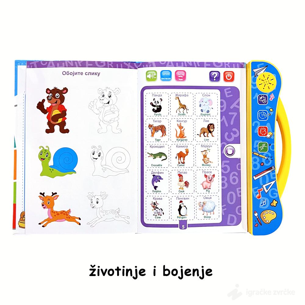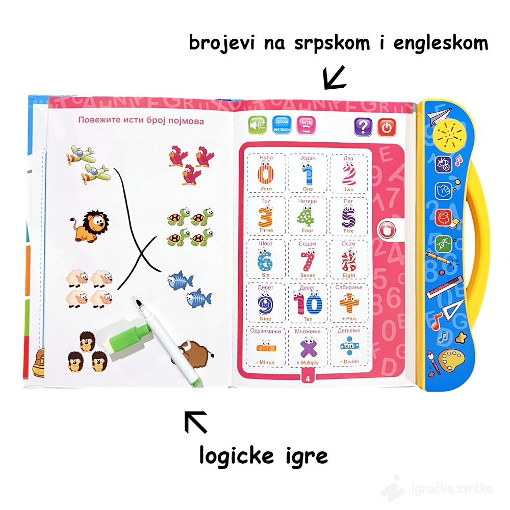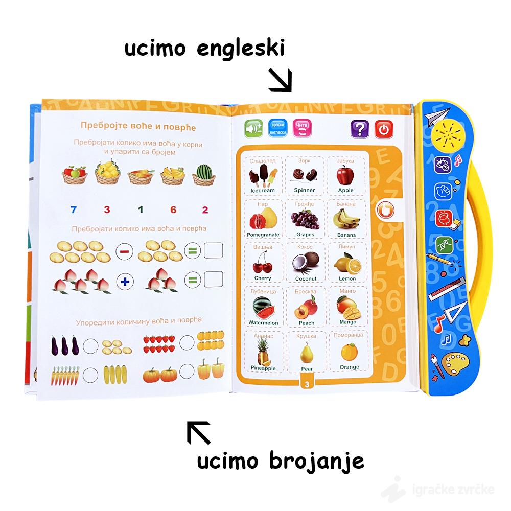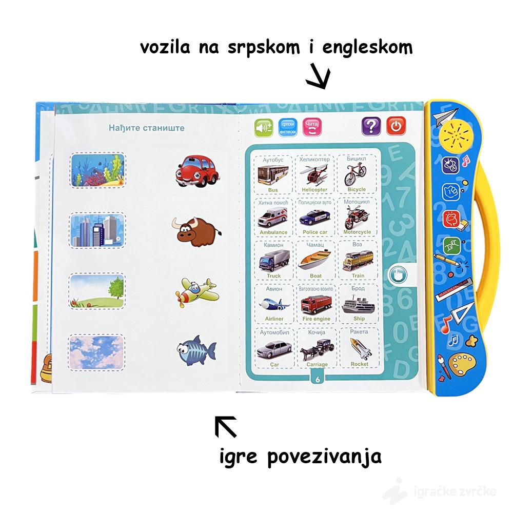 U ovoj knjizi, deca će otkriti interaktivne funkcije koje im pomažu da nauče osnove azbuke, brojeve, pojmove iz okoline, i mnogo više, na srpskom i engleskom jeziku. Osim toga, knjiga nudi niz igara i zadataka koji podstiču prepoznavanje pojmova, razvijajući pritom jezičke i kognitivne veštine.