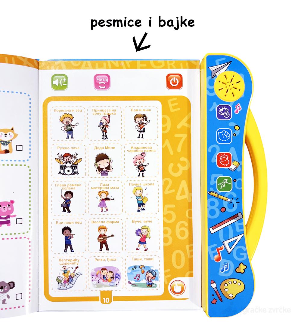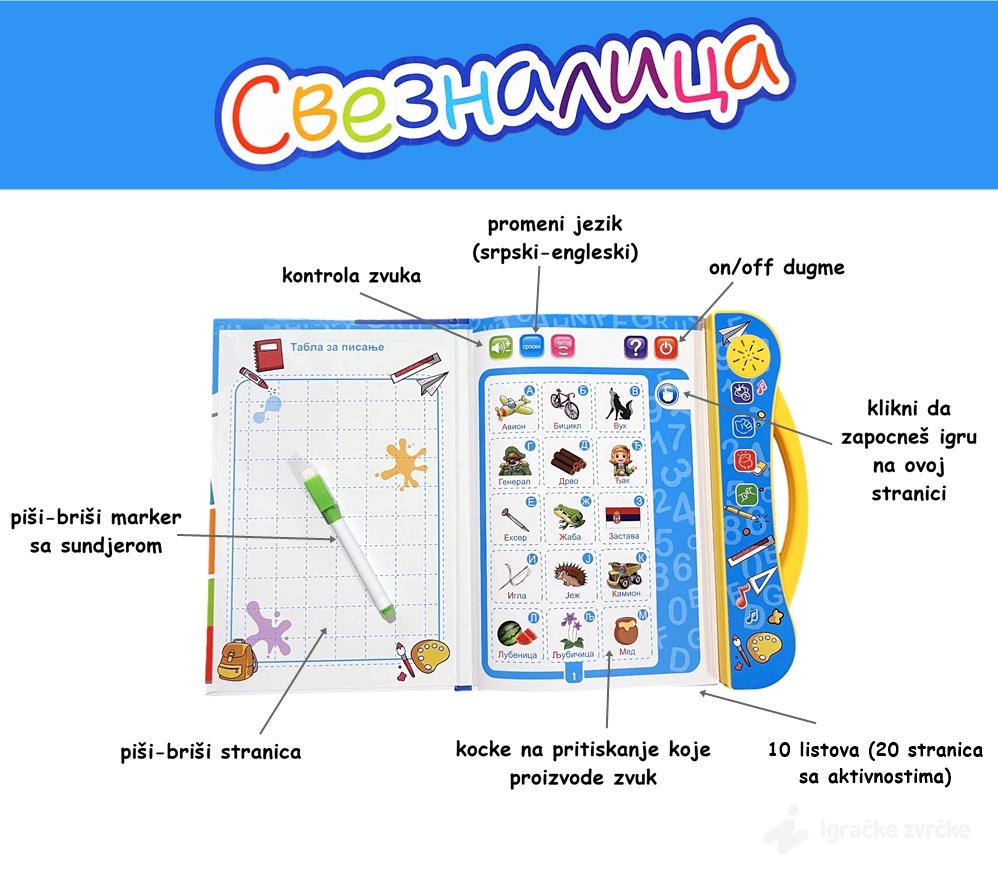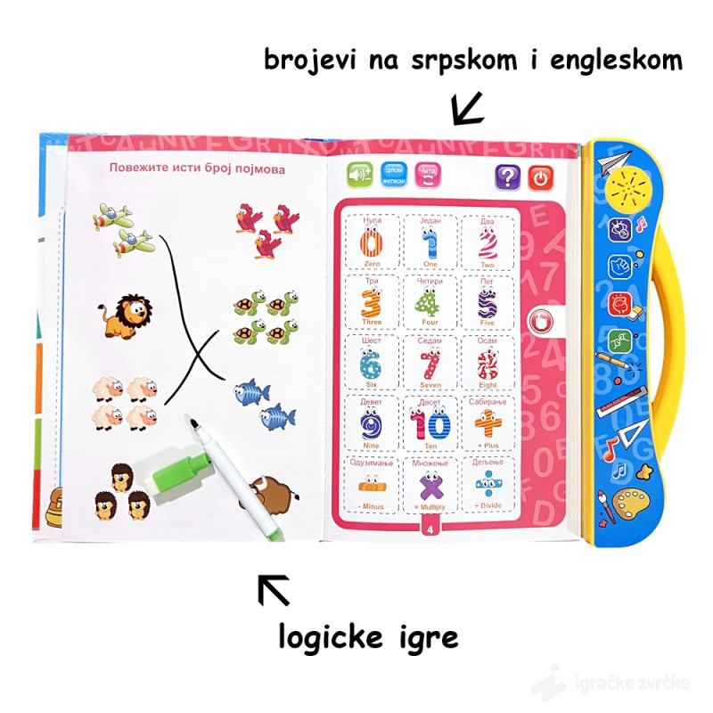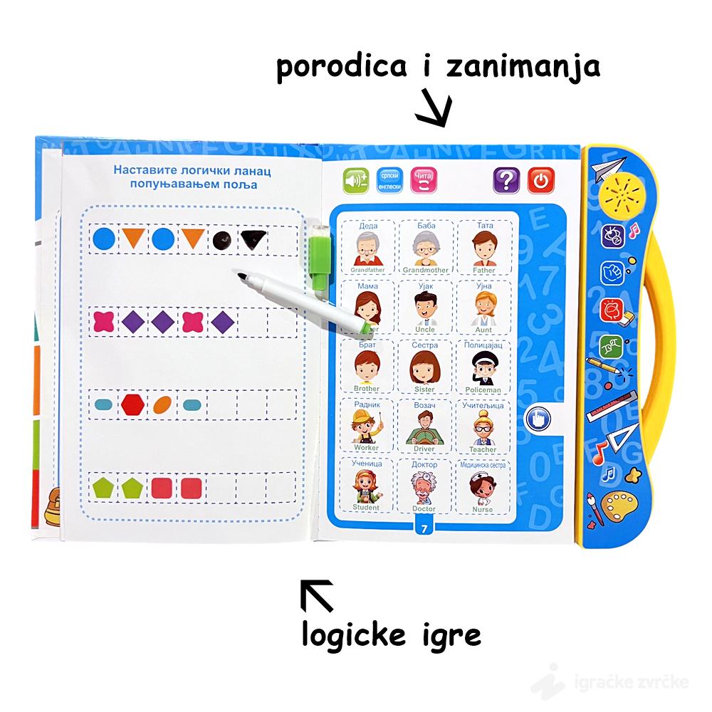 U ovoj knjizi, deca će otkriti interaktivne funkcije koje im pomažu da nauče osnove azbuke, brojeve, pojmove iz okoline, i mnogo više, na srpskom i engleskom jeziku. Osim toga, knjiga nudi niz igara i zadataka koji podstiču prepoznavanje pojmova, razvijajući pritom jezičke i kognitivne veštine.