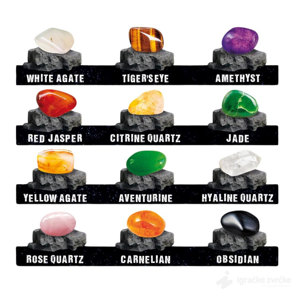 • Kolekcija sadrži sledeće minerale: beli ahat, tigrovo oko, ametist, crveni jaspis, limun kvarc, žad, žuti ahat, aventurin, prozirni kvarc, kvarc, karneol, opsidijan