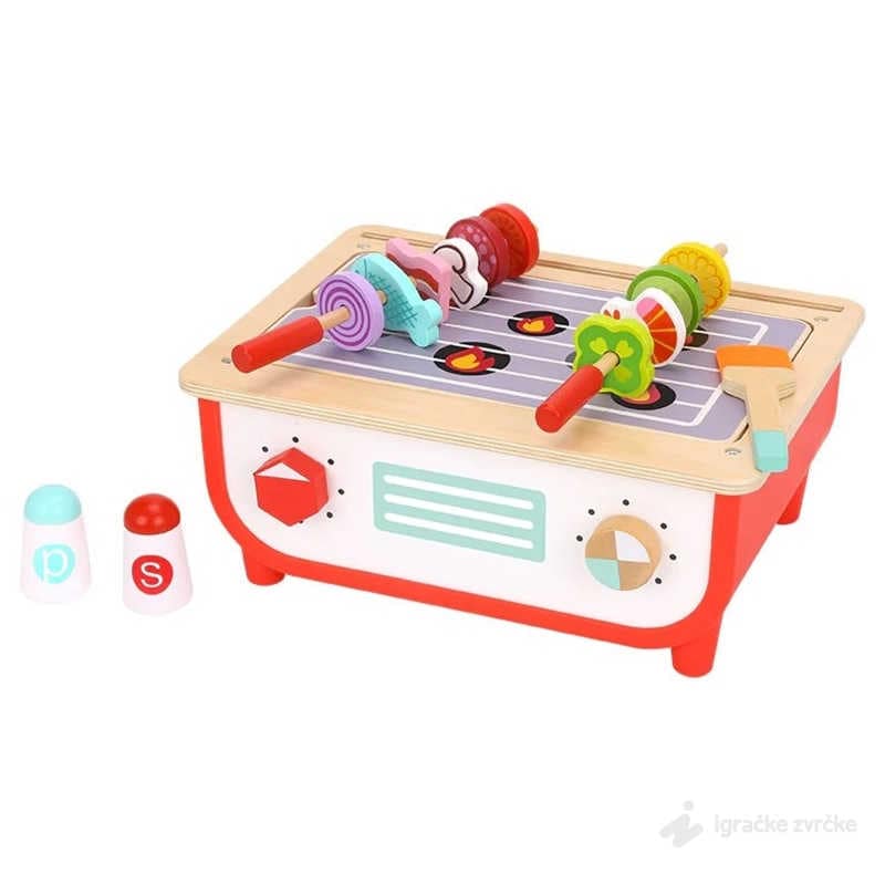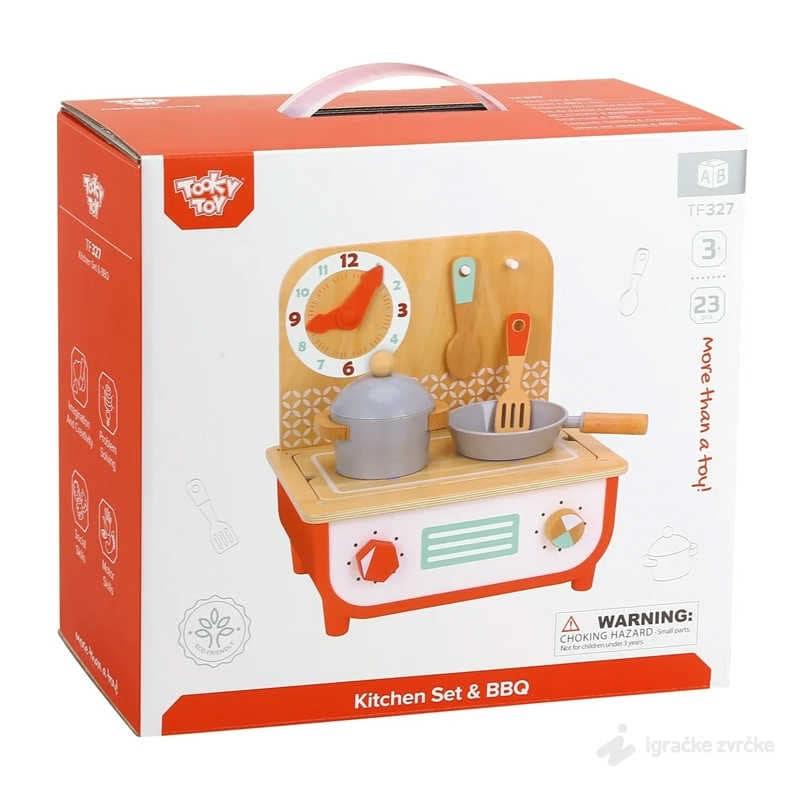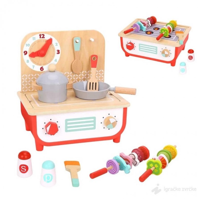 Tooky Toy Mini Drvena kuhinja 2u1 svojim prelepim dizajnom i dodatnim elementima čini igru uloga još realnijom i zanimljivijom. U ovom setu dobijate čak 2 igračke u jednoj. Kuhinjica se lako i brzo pretvara u roštilj što će decu oduševiti i pružiti im još igre.