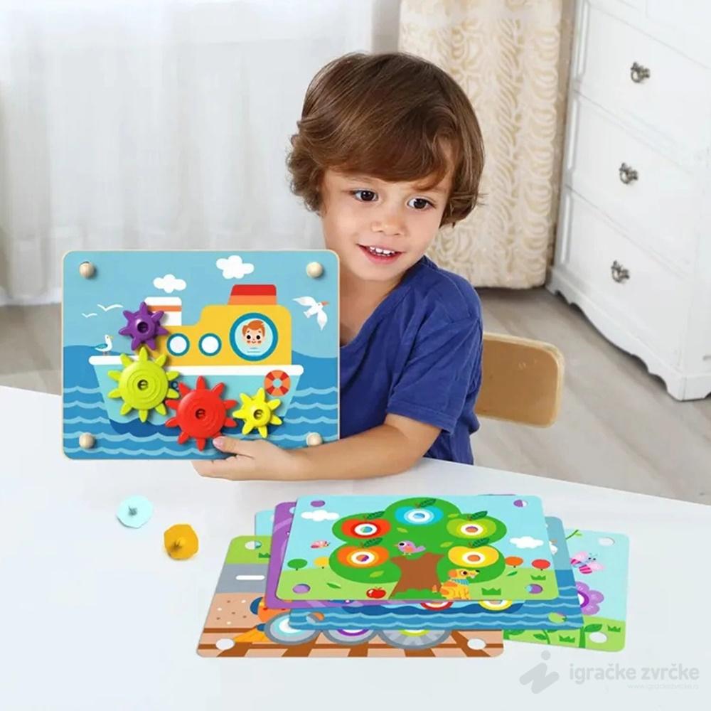 Naučite svoju decu da budu budući inženjeri uz ovu fantastičnu edukativnu igru sa složenim konceptom i jednostavnim dizajnom. Jednostavno stavite jednu od šest dvostranih slika na drvenu ploču. Sa rupama koje ste dobili, postavite zupčanike u rupe.