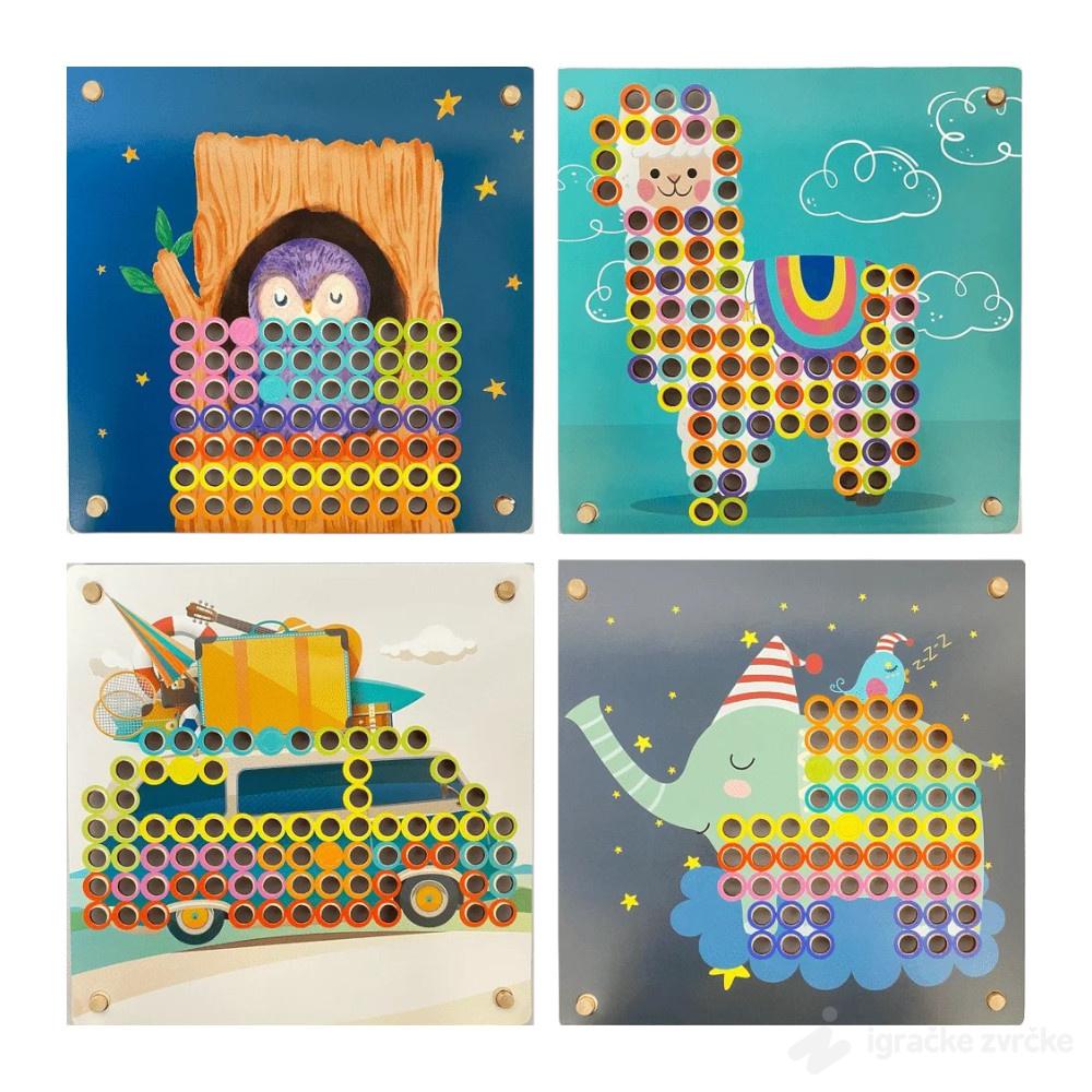 • Komplet sadrži drvenu tablu sa rupicama, bockice različitih boja, kao i pertle za provlačenje