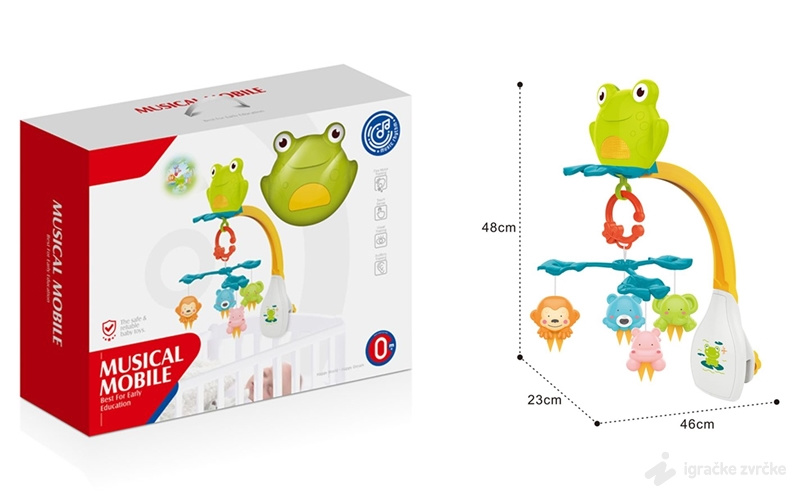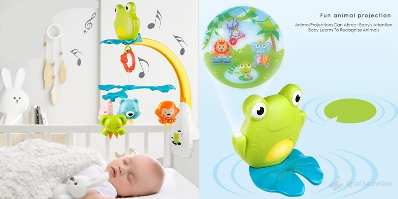 Ova vrteška ima 4 viseće igračke zabavnog dizajna i projektor na vrhu u obliku žabca koji projektuje crteže životinja.