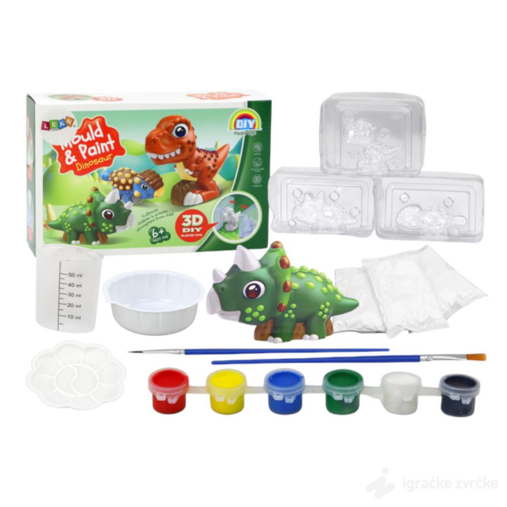 Ovaj DIY kreativni set omogućava deci da sama naprave i ukrase figure dinosaurusa od gipsa. Proces je jednostavan i prilagođen deci – od sipanja mase u kalupe do bojenja gotovih figura.