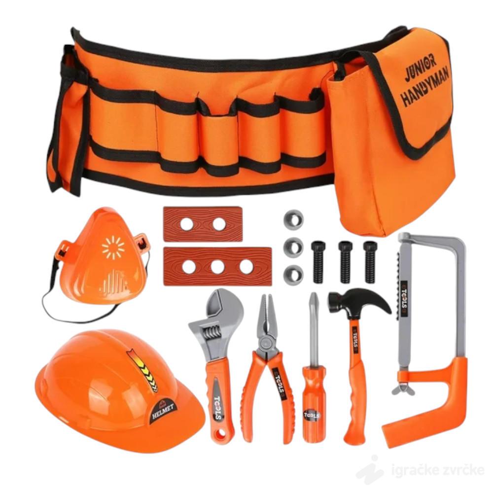 Set dolazi sa širokim izborom realističnih alatki prilagođenih dečijoj veličini, uključujući ključeve, šrafciger, klješta, čekić, testeru, šrafove i drvene imitacije dasaka.