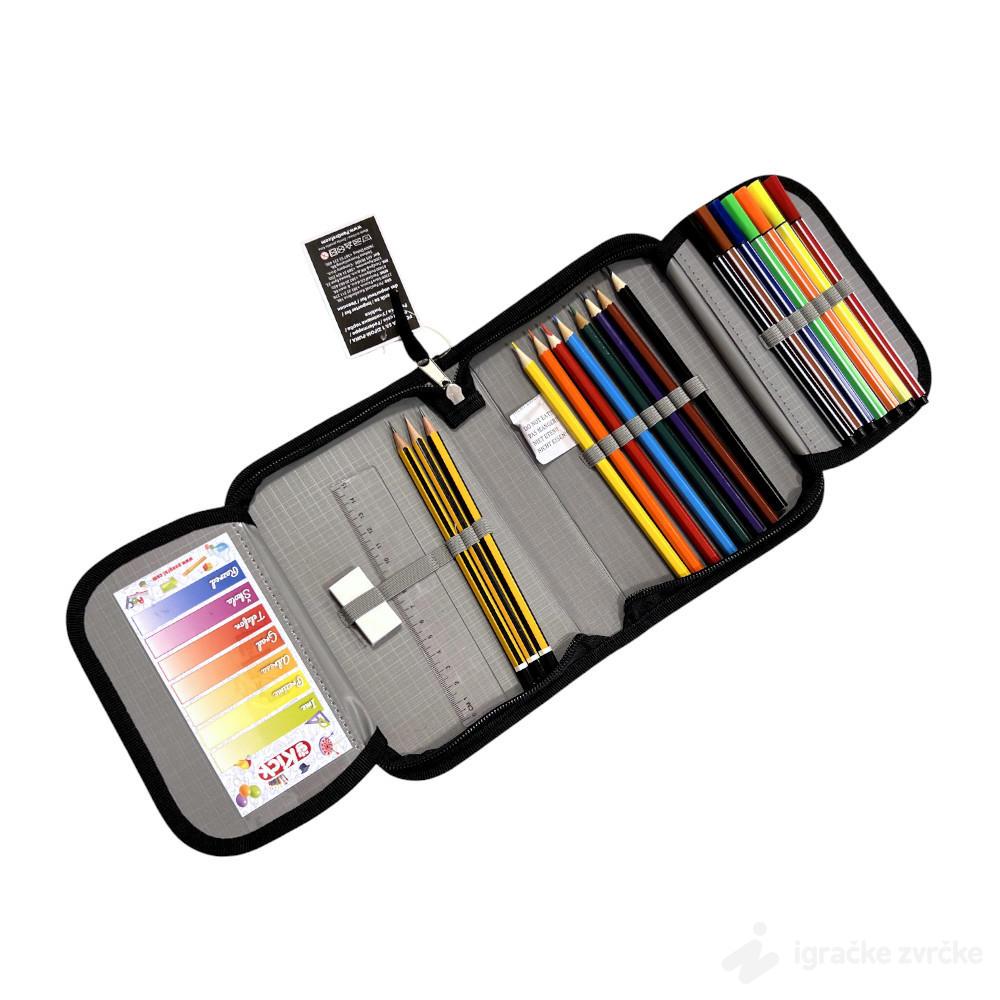 • Sadrži sve što je potrebno za školu – olovke, bojice, flomastere, lenjir i gumicu – sve uredno složeno i spremno za upotrebu