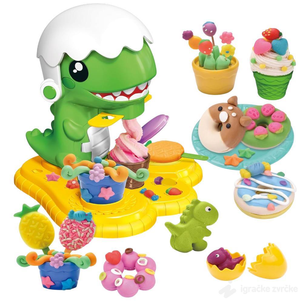 Dete može da koristi različite boje plastelina, kalupe i dodatke kako bi pravilo kolače, sladolede i razne oblike, dok dinosaurus dodaje element iznenađenja „praveći“ figure.