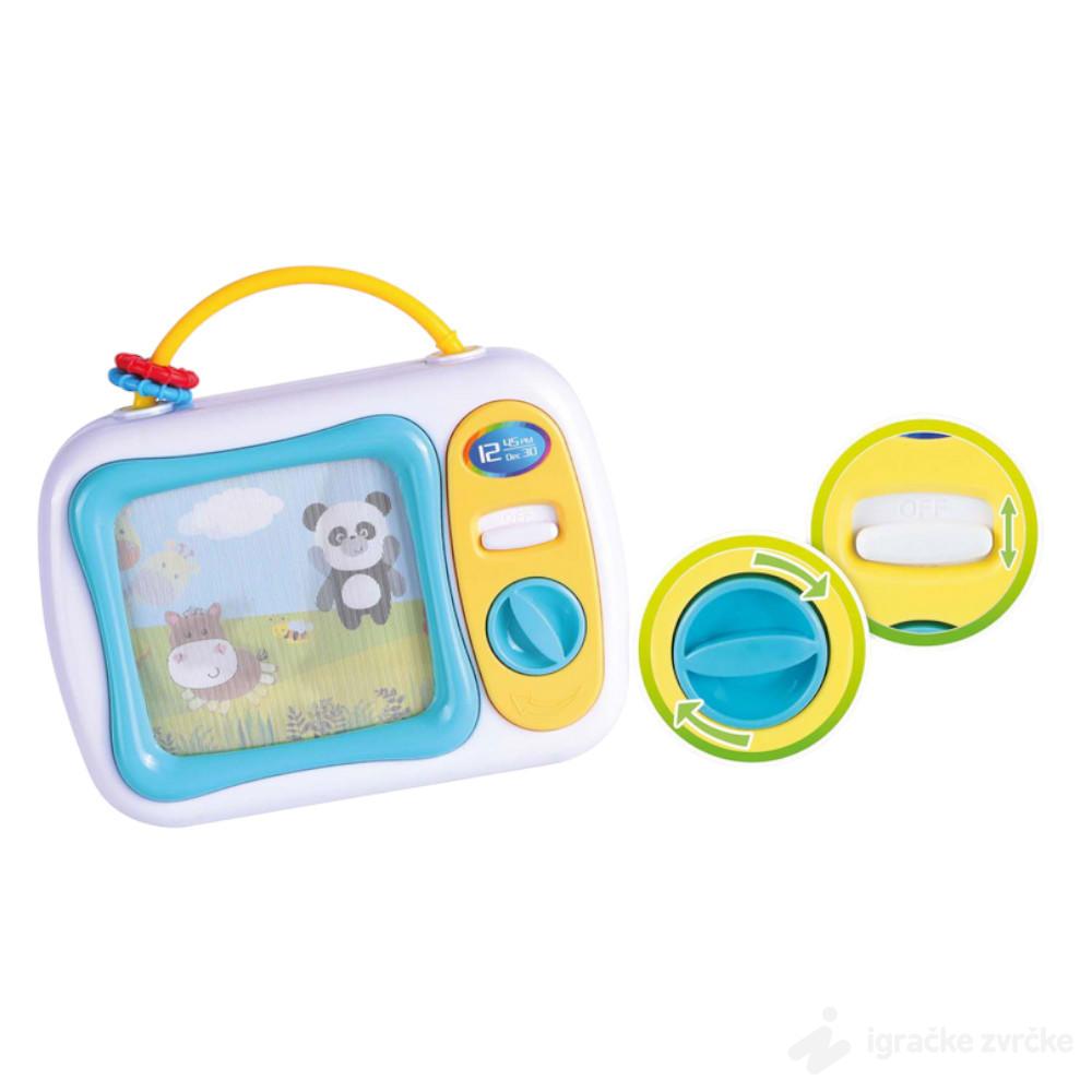 Bebi televizor sa životinjama je nežna, stimulativna igračka namenjena najmlađima, već od 6 meseci. Okretanjem točkića mehanizam se navije i pokreće se simpatična slika sa pandom, žirafom, konjićem i drugim životinjama, stvarajući efekat male animacije.