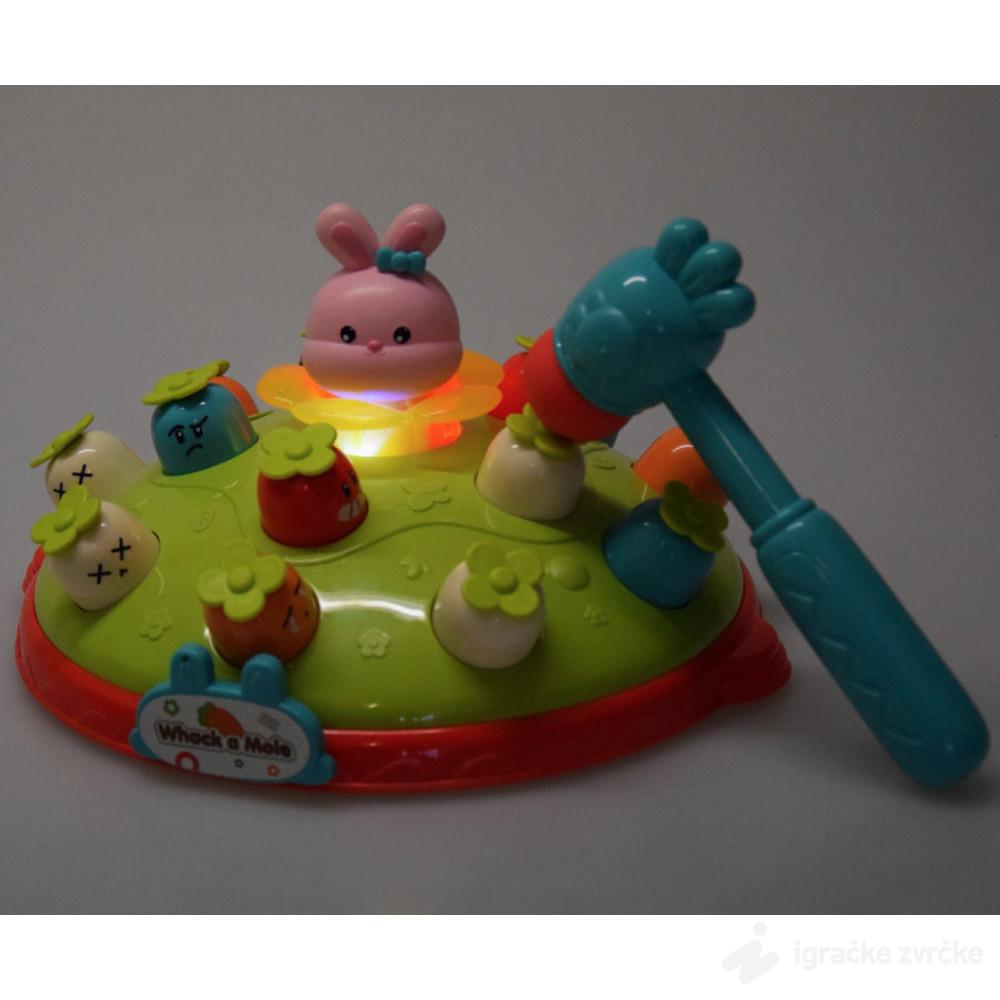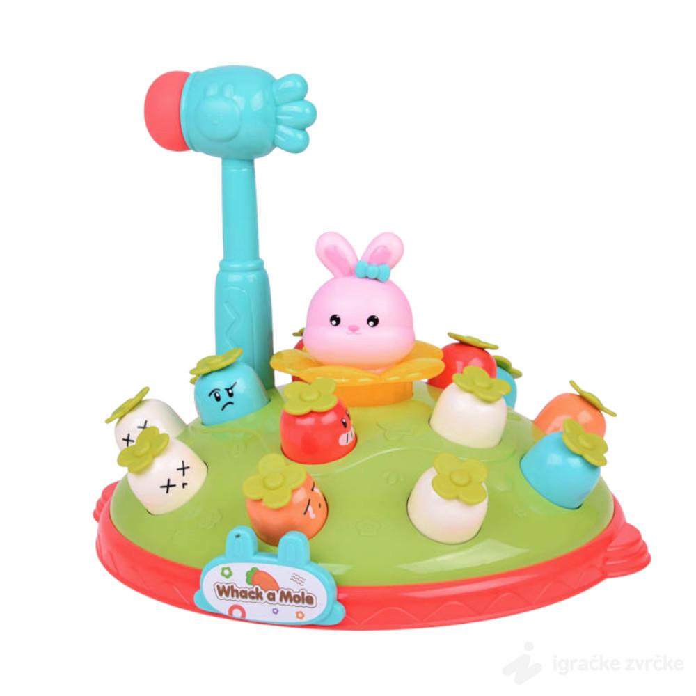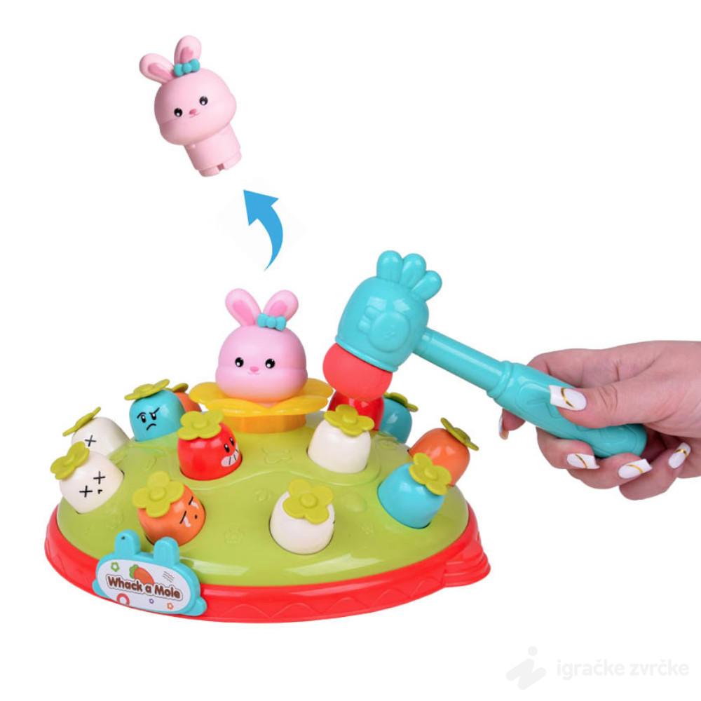 Ova preslatka „Whack-a-Mole“ igračka sa šargarepicama i zekom donosi dinamičnu, interaktivnu zabavu koja decu istovremeno pokreće i zasmejava. Raznobojne glavice iskaču iz zemlje i izazivaju mališane da ih brzo pogode mekanim čekićem.
