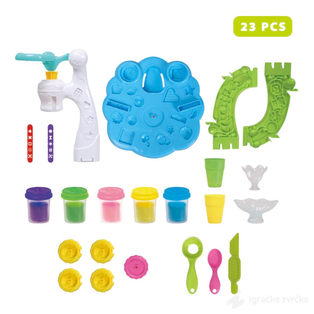 Ovaj bogat set sa plastelinom omogućava deci da prave sladolede, kolače i razne slatke oblike pomoću posebne mašine za oblikovanje. Kroz jednostavan mehanizam pritiskanja i veliki broj kalupa, dete samo kreira svoje „poslastice“.