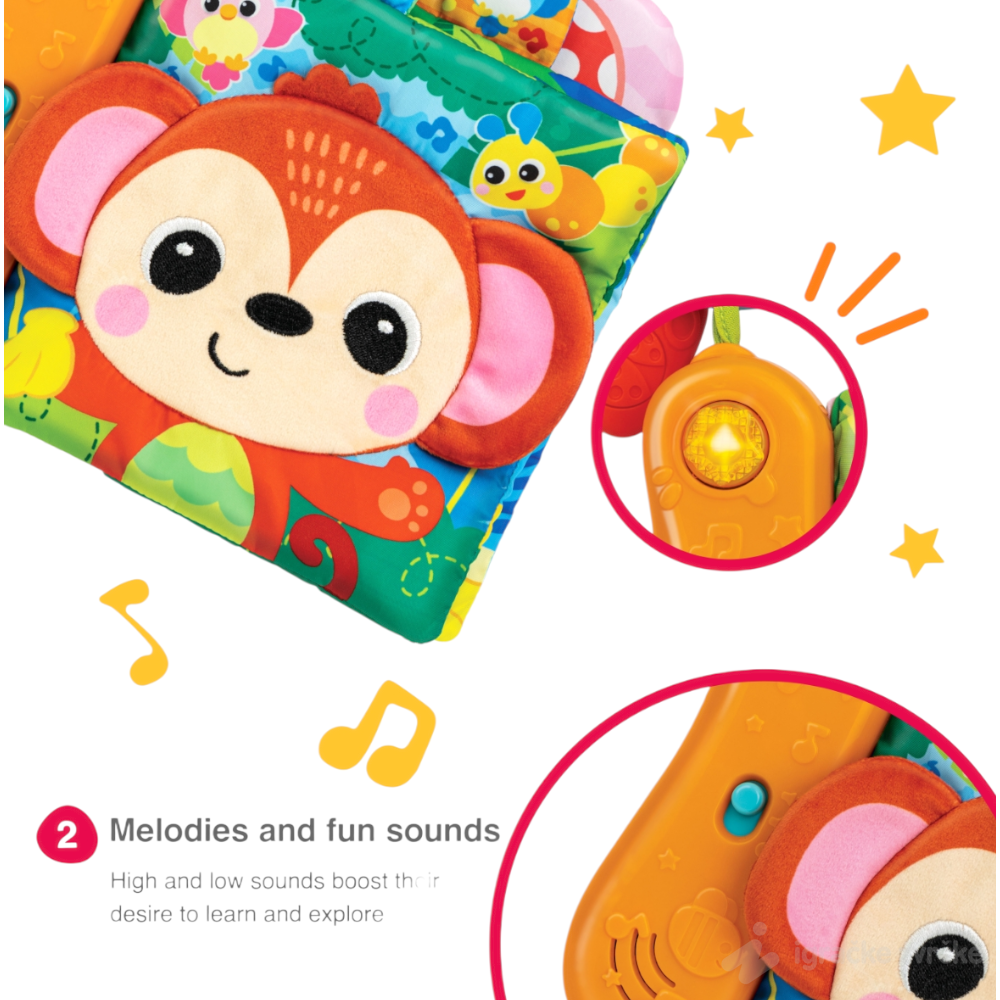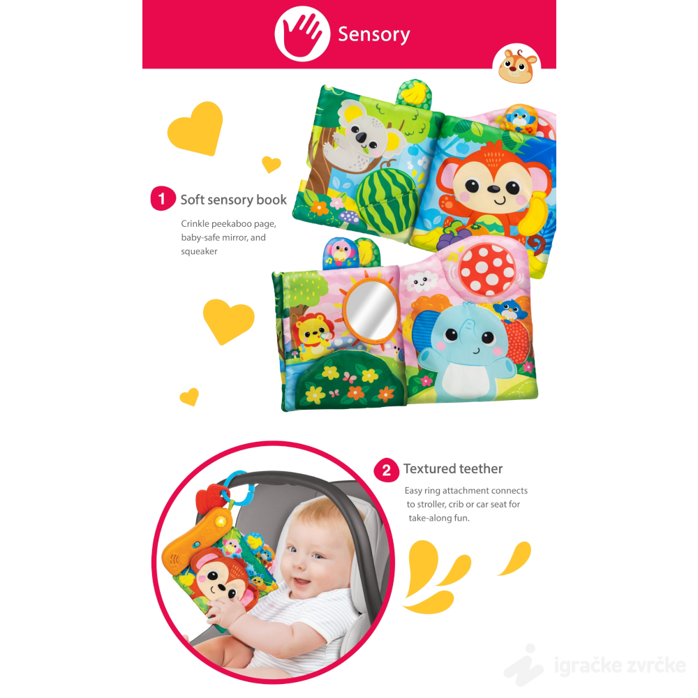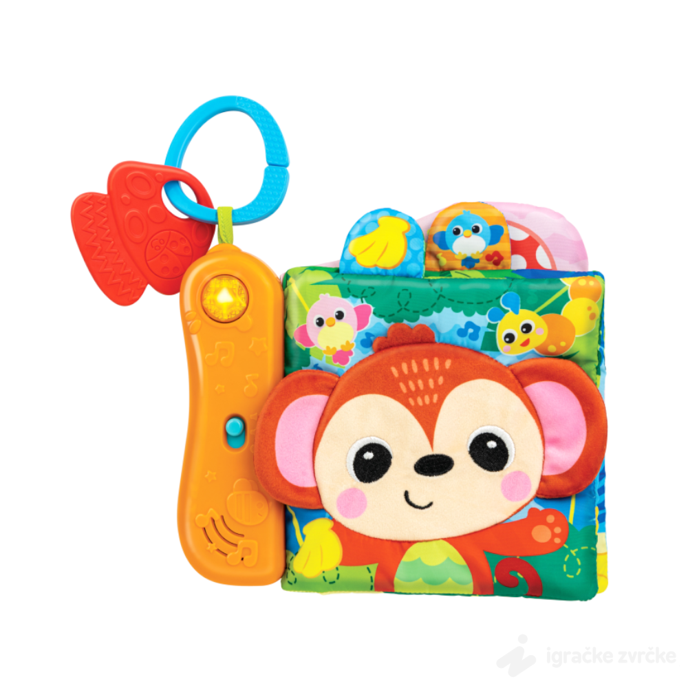Otkrijte nova iskustva uz muzičku i senzornu knjigu o životinjama iz džungle. Dizajn: knjiga je dimenzija 20 x 15 cm, ima šareni dizajn i kombinuje različite teksture i elemente (kukavicu, ogledalce bezbedno za bebe i škripu); sa glodalicom za lako pričvršćivanje na kolica, krevetac ili auto-sedište. Funkcije: dugme za svetlo, ptica i banana za pritiskanje i slušanje zvučnih efekata i melodija i dugme za napajanje jakom/slabom jačinom zvuka. Vrednosti: podstiče senzornu stimulaciju i razvija fantaziju i emocije.