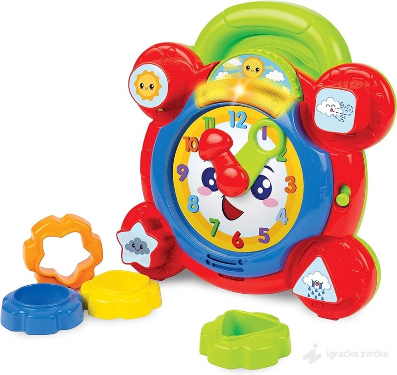 MULTIFUNKCIONALNA IGRAČKA Win Fun igračka za bebe VESELI ČASOVNIK je igračka koja nudi nekoliko načina igre. Sat ima kazaljke koje se mogu pomerati i na taj način će dete kroz igru naučiti kako da gleda na sat. Četiti baze za slaganje oblika podstiču igru rukama i razmišljanje. Disk se vrti i pokazuje dan i noć.