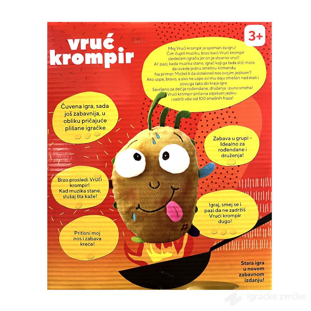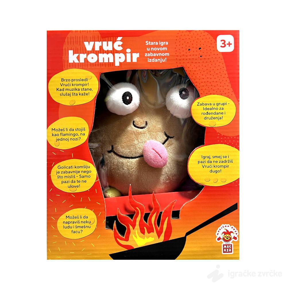 Vruć krompir je omiljena društvena igra u potpuno novom, mekanom i pričajućem izdanju. Plišana igračka daje nasumične i urnebesne zadatke koji podstiču decu da se kreću, skaču, glume, prave smešne face i brzo reaguju.